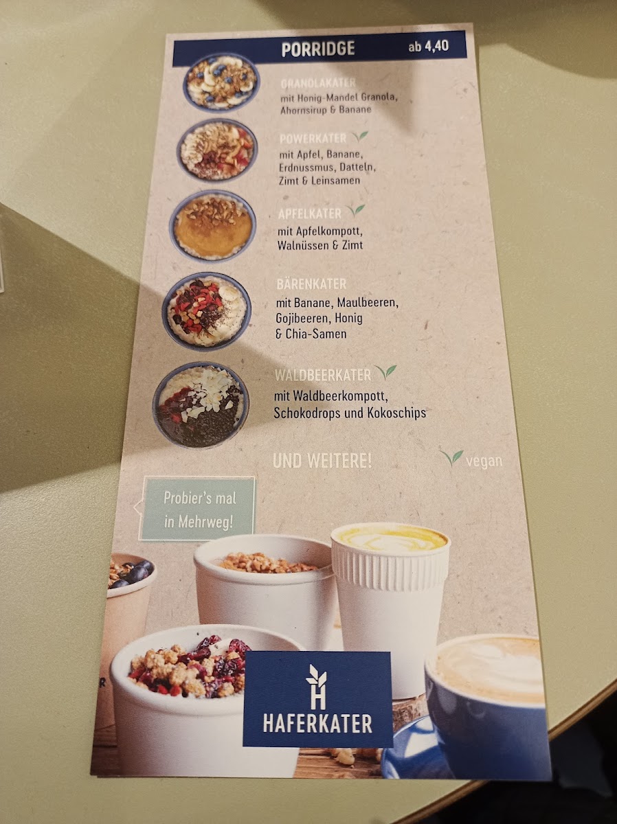 Whether you're on the go or taking a moment to relax, Haferkater offers a nourishing and satisfying option that caters wonderfully to both vegan and non-vegan diets. The café's commitment to using healthy ingredients at reasonable prices ensures that everyone can enjoy a guilt-free meal without breaking the bank. The vegan options, however, could be made more visible to cater to international travelers unfamiliar with the menu's offerings.